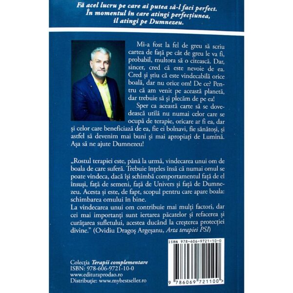 Mi-a fost la fel de greu să scriu cartea de față pe cât de greu le va fi, probabil, multora să o citească. Dar, sincer, cred că este nevoie de ea. Cred și știu că este vindecabilă orice boală, dar nu orice om! De ce? Pentru că am venit pe această planetă, dar trebuie să și plecăm de pe ea! Sper ca această carte să se dovedească utilă nu numai celor care se ocupă de terapie, oricare ar fi ea, dar și celor care beneficiază de ea, fie ei bolnavi, fie sănătoși, și astfel să devenim mai buni și mai apropiaţi de Lumină. Așa să ne ajute Dumnezeu! „Rostul terapiei este, până la urmă, vindecarea unui om de boala de care suferă. Trebuie înțeles însă că numai omul se poate vindeca, dacă își schimbă comportamentul față de el însuși, față de semeni, față de Univers și față de Dumnezeu. Acesta și este, de fapt, scopul pentru care apare boala: schimbarea omului în bine. La vindecarea unui om contribuie mai mulți factori, dar cei mai importanți sunt iertarea păcatelor și refacerea și curățarea sufletului, acestea ducând la creșterea protecției divine.” (Ovidiu Dragoș Argeșanu, Arta terapiei PSI)